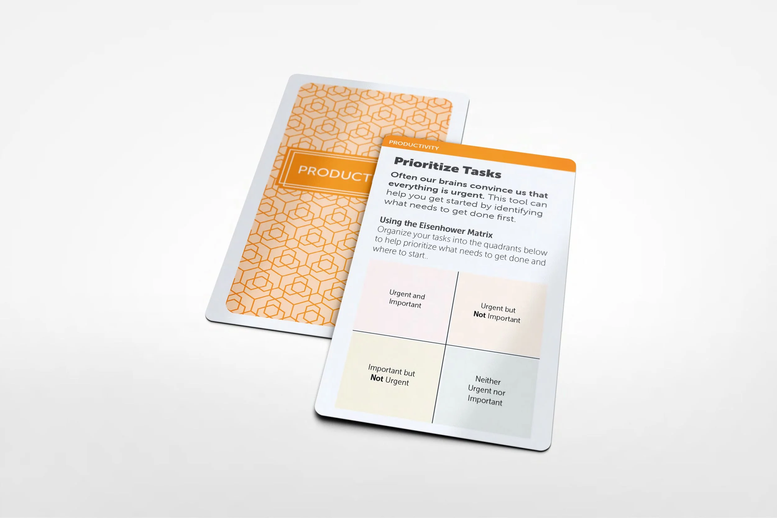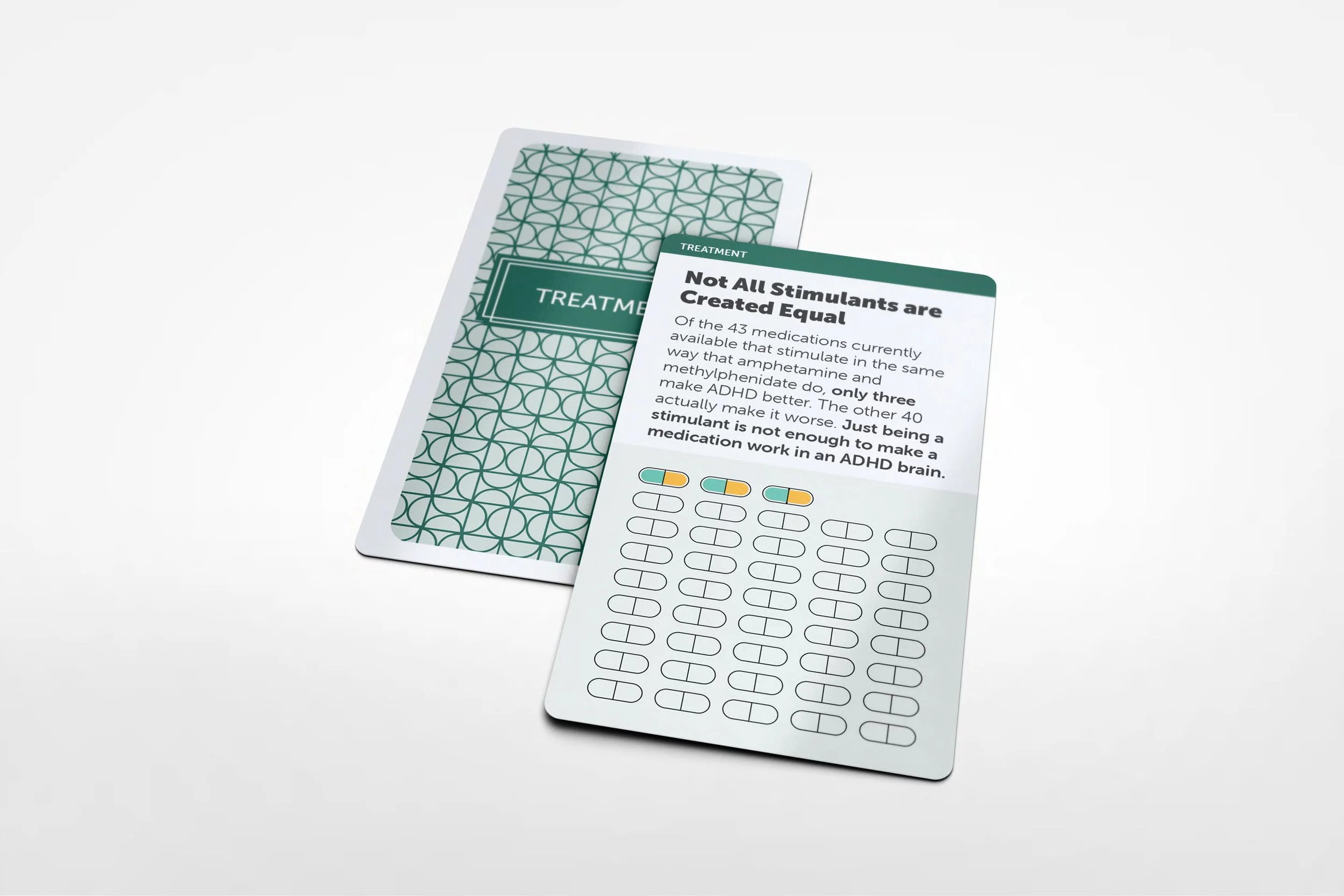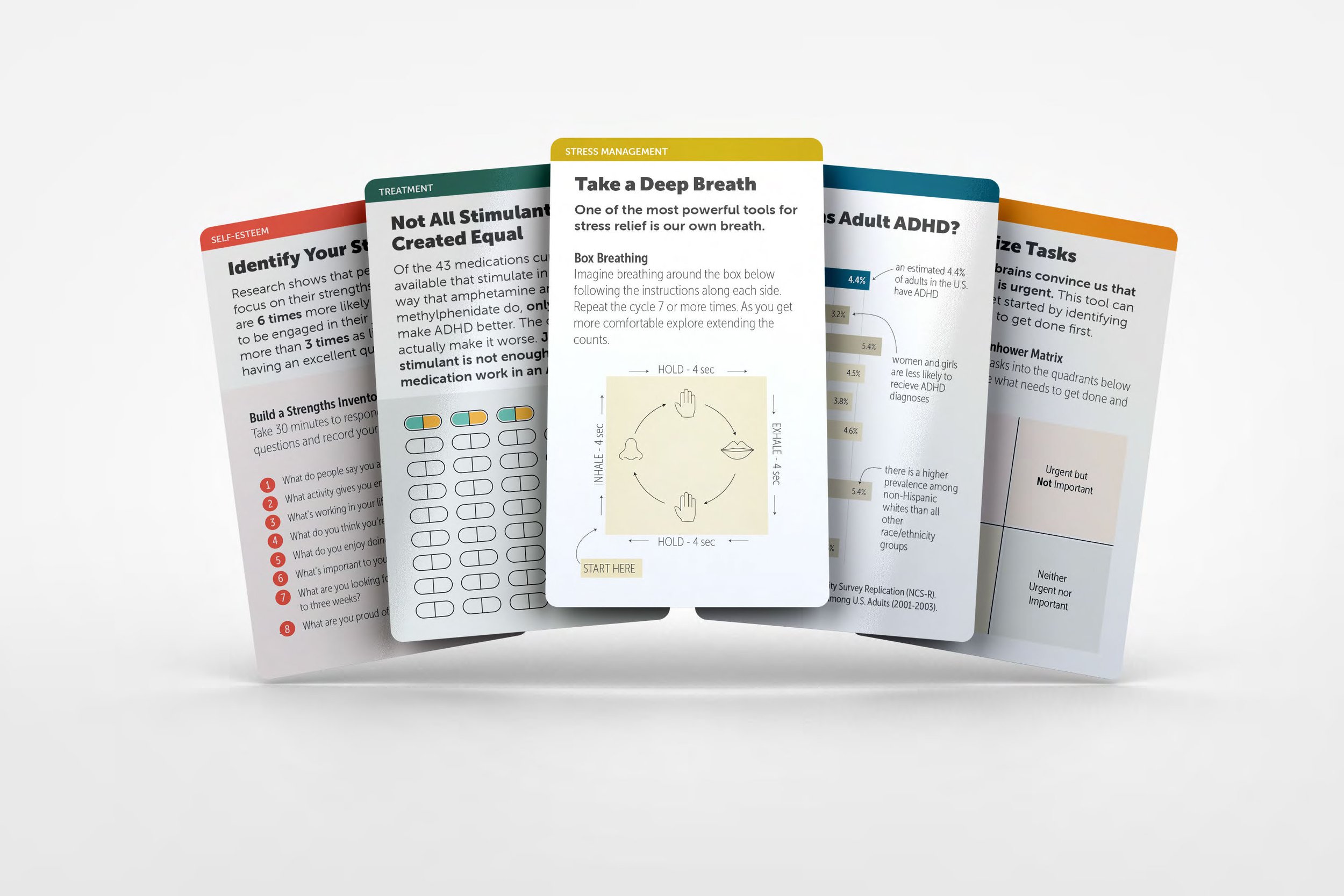 This sample deck of strategy cards was designed for a Visual Storytelling project. The idea is that each card contains a visually represented “bite” of information on Adult ADHD. The cards offer insight into the research and/or strategies that can be adopted.